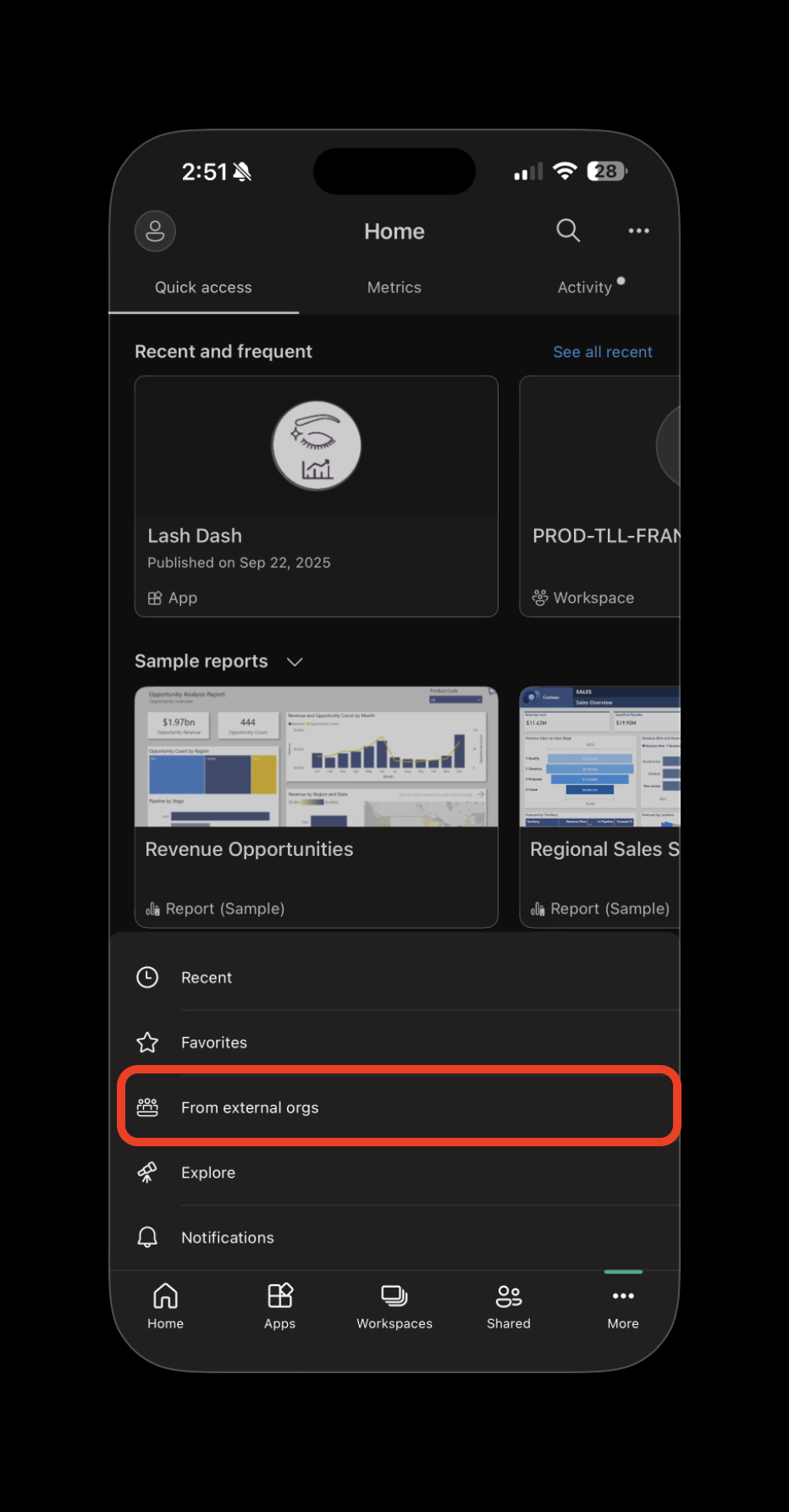 Important: Microsoft has updated the mobile app interface. Reports shared from external organizations (like HTT Brands corporate) now appear in a dedicated "From external orgs" section rather than requiring manual tenant switching.
